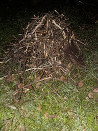 a bird's nest on the ground next to a fire hydrant