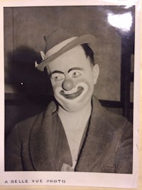 a black and white photo of a clown wearing a hat